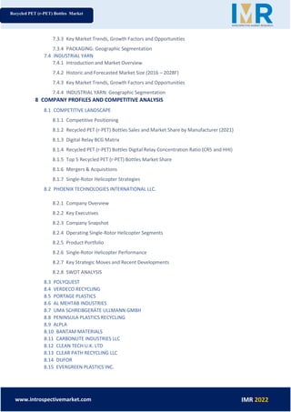 Therefore, all PVC labels (identified by sight) are removed. /Subtype /Form In conclusion, PET offers more or less the same physical properties as glass for cleanliness, taste and gas impermeability. Plastic material is expensive to haul, so entrants need to consider setting up facilities close to the material and markets. :j3@g>3hr/ug5E`e[ 2(SA%W-{n=SJk&igyYzM8O:-5$$nUFCX:]oO$Un"^q(TsvkCZu#S)#bNoZr7X#U'>uAB AnYh6WQ@X*l3wEM-|U#{ W&)p`ILmUxL