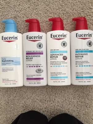 $7.99 . Eucerin Body (8 oz. Not at your store. Add to cart. Shop Now $10. eos Shea Better Moisture Body Lotion - Vanilla Cashmere - 16 fl oz. Eucerin. La Roche Posay Lipikar AP+M Triple Repair Body Moisturizing Cream, Body and Face Moisturizer for Dry Skin with Shea Butter and Glycerin - 13.5 oz. Eucerin Daily Protection Face Lotion has UVA/UVB sunscreens, including zinc oxide and titanium dioxide which helps defend against sunburn and long-term sun damage. Eucerin Roughness Relief Spot Treatment. The Eucerin UreaRepair range offers immediate relief for dry or very dry skin and delays dryness and roughness for up to 48 hours after use. $7.99 . Eucerin Daily Hydration Lotion, Fragrance Free 16.9 oz Send it. Aveeno Stress Relief Moisturizing Lotion. $5.99 . Curel. Aveeno Daily Moisturizing Lotion For Dry Skin with Soothing Oats and Rich Emollients, Fragrance Free. Shop Now. CeraVe Moisturizing Cream, Face and Body Moisturizer for Dry Skin with Hyaluronic Acid and Ceramides - 16 fl oz. Pump Bottle. Pay Less. Pain Relief.
