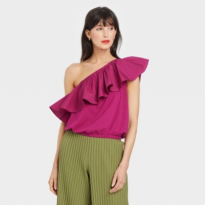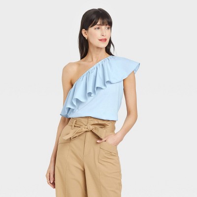 Keep your going-out looks in vogue with this One Shoulder Ruffle Top from A New Day. This solid-colored one-shoulder top makes a stylish and versatile addition to any ensemble. See how a store is chosen for you. If the item details above arent accurate or complete, we want to know about it. Prices, promotions, styles and availability may vary by store & online.