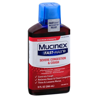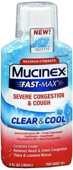 Mucinex FAST-MAX SEVERE CONGESTION & COUGH Dextromethorphan HBr Cough Suppressant Guaifenesin Expectorant Phenylephrine HCl Nasal Decongestant Controls Cough; Relieves Nasal & Chest Congestion; Thins & Loosens Mucus; 6 FL OZ (180 mL) FOR AGES 12+ 031717 3046243 Mucinex 12-hour Chest Congestion Expectorant Tablets - Target ACTIVE INGREDIENTS; (in each 20 mL) Maximum Strength MUCINEX Fast-Max Severe Congestion & Cough: Dextromethorphan HBr 20 mg Purpose(s) Cough suppressant ; Guaifenesin 400 mg Purpose(s) Expectorant ; Phenylephrine HCl 10 mg Purpose(s) Nasal decongestant This product contains 6 Fluid Ounces. Instead, dispose of it safely in the trash.