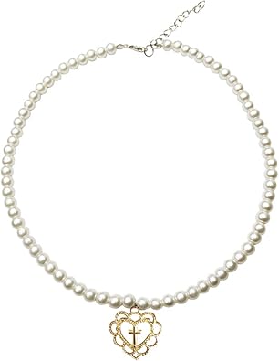Faux pearl choker necklace with a heart cross charm and an adjustable lobster clasp closure. cross set with white zircons, approx. (20% off), ad by JaneMcCartneyJewelry Ad from shop Silesta Gems4JewelsLLC }