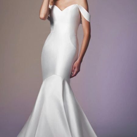 One of our favorite V-neck with off the shoulder styles is Nerida by Sottero and Midgley. This A-line, simple wedding dress features two looks in one, with the option for removable off-shoulder lace sleeves to add a touch of whimsy to the originally strapless sweetheart neckline. A layer of perfecting satin lays against the skin, ensuring all-day comfortable wear, while ethereal and detailed Alencon lace swims all along the fit-and-flare silhouette. Your spouse-to-be will never forget this timeless look! This stunning two-piece gown is handcrafted from layers of floral burnout silk and crepe de chine. With its off-the-shoulder neckline, accentuated waistline, and delicately embellished chantilly lace bodice, this stunner makes a statement. Size Range: Inquire With Retailer |Runs: Small | Length:Floor-length |Materials: 3D Floral Appliqu and Crepe. This embroidered sheer tulle ballgown is adorned with 3D rose motifs and features a sheer corset pleated skirt and a dramatic, ruffled off-the-shoulder neckline. Style 2366 Audree is a sparkling siren, bedazzled in beaded Chantilly lace from head to toe. This design is whimsical yet sultry an ideal trend for boho brides. Its all the red-carpet royalty of a vintage bridal gown, while the soft satin adds the perfect dose of undone.. Size Range: Inquire With Retailer |Runs: Small | Length:Floor-length |Materials: Satin. Mermaid silhouette will also flatter a bride with an inverted triangle or a rectangle shaped figure.