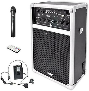 800w pyle Using in a music classroom, works like a charm. Works great with a flash drive! The lavalier is unusable as the clip slides onto the mic and therefore is not fastened to the mic. loudspeaker The molded cabinet housing is rough and rugged, while the speakers are protected by the metal grill, so you know your sound is secure when on the move. portable pyle pa system dock 800w ipod mics sd wireless usb fm This ia a great little portable PA system..We are using it for out high school softball games.