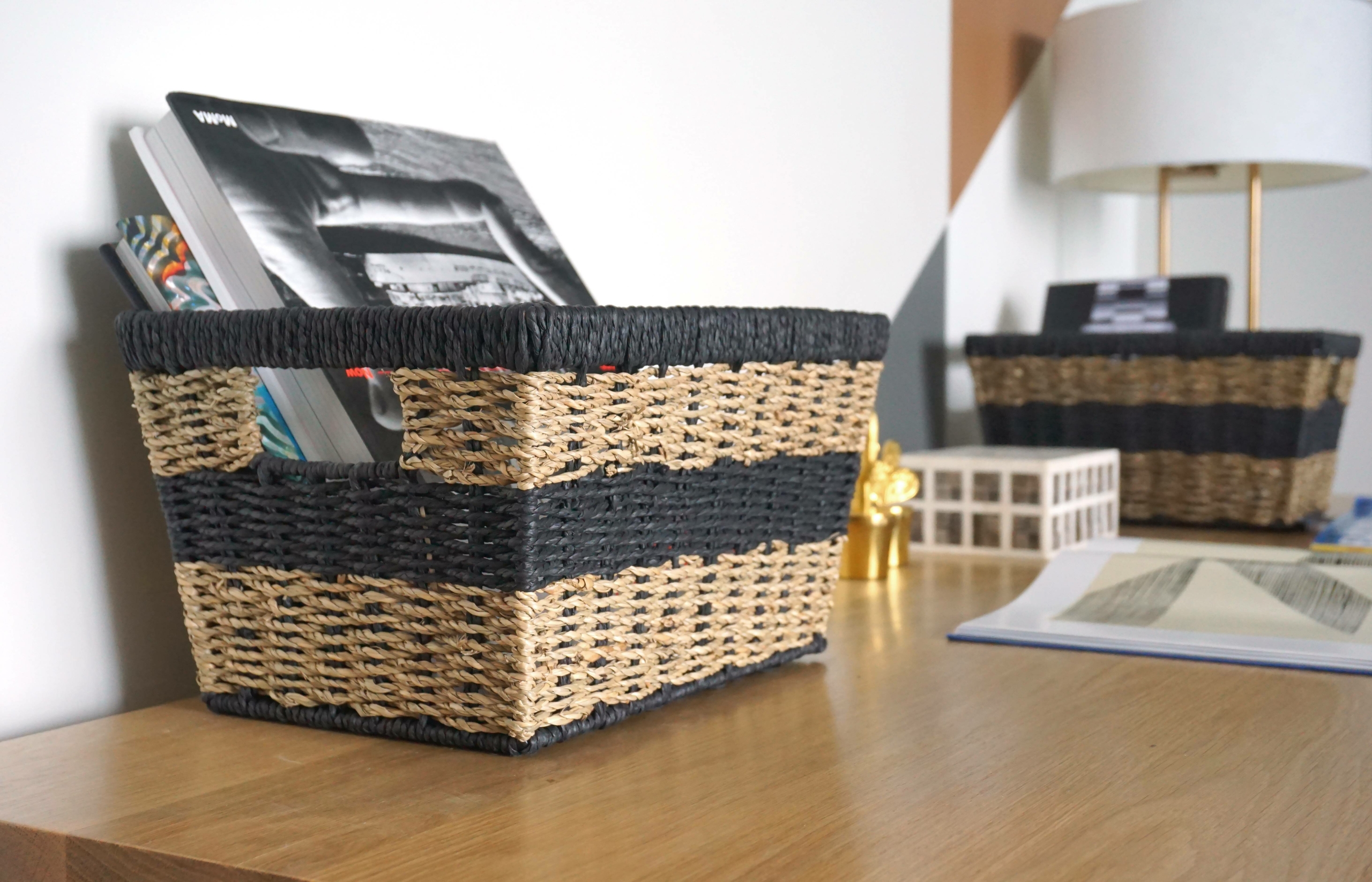 Mix and match baskets in drawers, cabinets, and on tabletops as you need They finish off my black and white bathroom organizing inside my vanity, except for a few towels they show off!